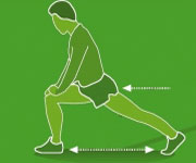 - Baldır kasının ve aşil kirişinin gerdirilmesi için öne doğru bir hamle adımı atınız. İki elinizle dizinize bastırınınız ve topuğunuz yerde olacak şekilde gerideki bacağınızı gerdiriniz. Bu işlemi diğer bacağınız içinde yapınız.